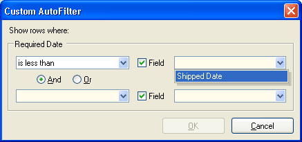 下面的插图举例说明了为 RequiredDate 列显示的定制的筛选对话框。 注意,取值组合框中不包括调用此对话框的列的标题,即使该列已经被包含在所提供的列集合中。